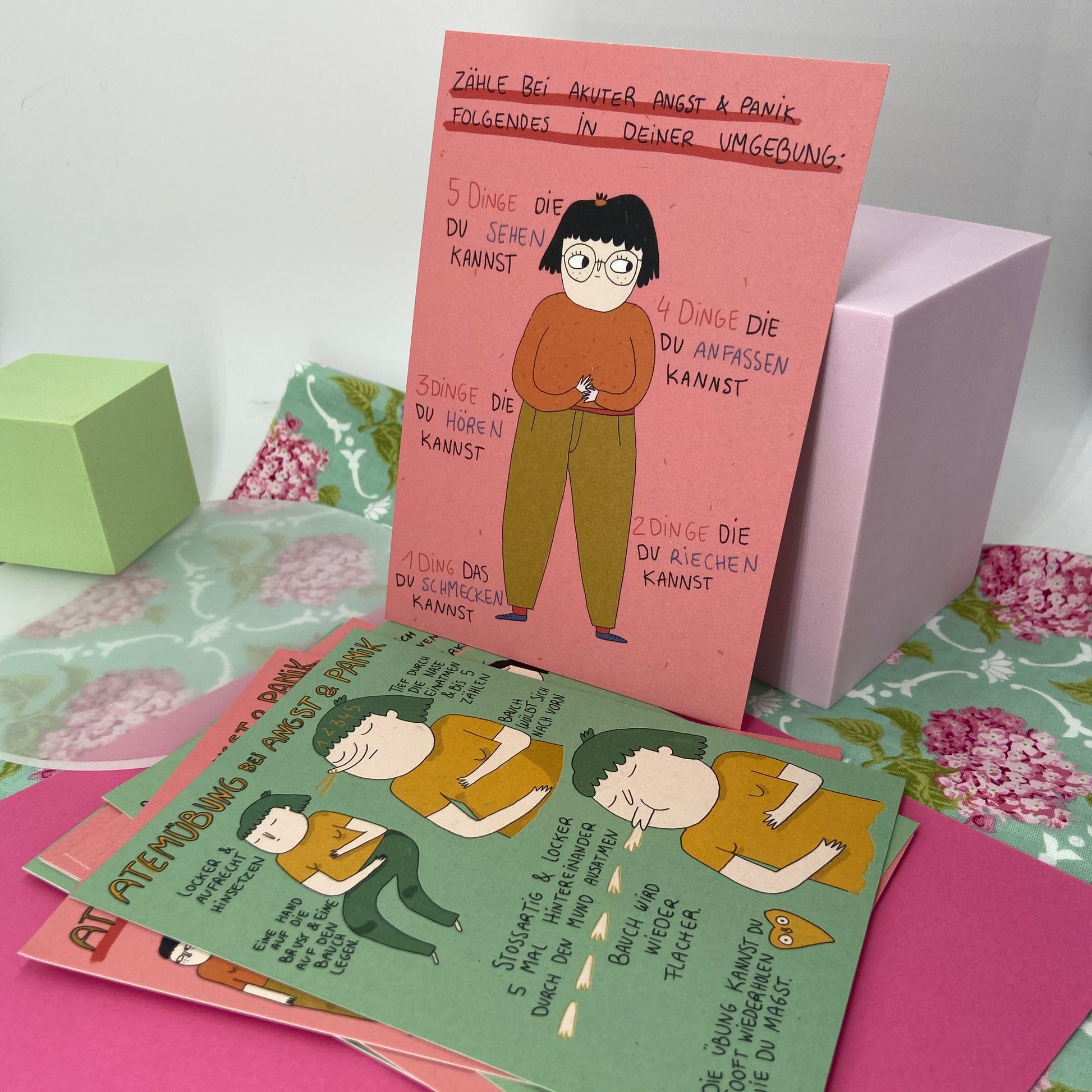 Postkarten mit Atem- und Beruhigungstechniken, die in Angstsituationen helfen können.